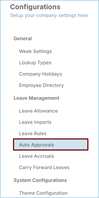 Then click on the "Auto Approvals" option in the side menu, located under the Leave Management category.