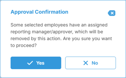 A confirmation message will prompt you to acknowledge that this action will remove any assigned reporting manager, if one exists. Click "Yes" to proceed, and you will see a success message confirming the changes.
