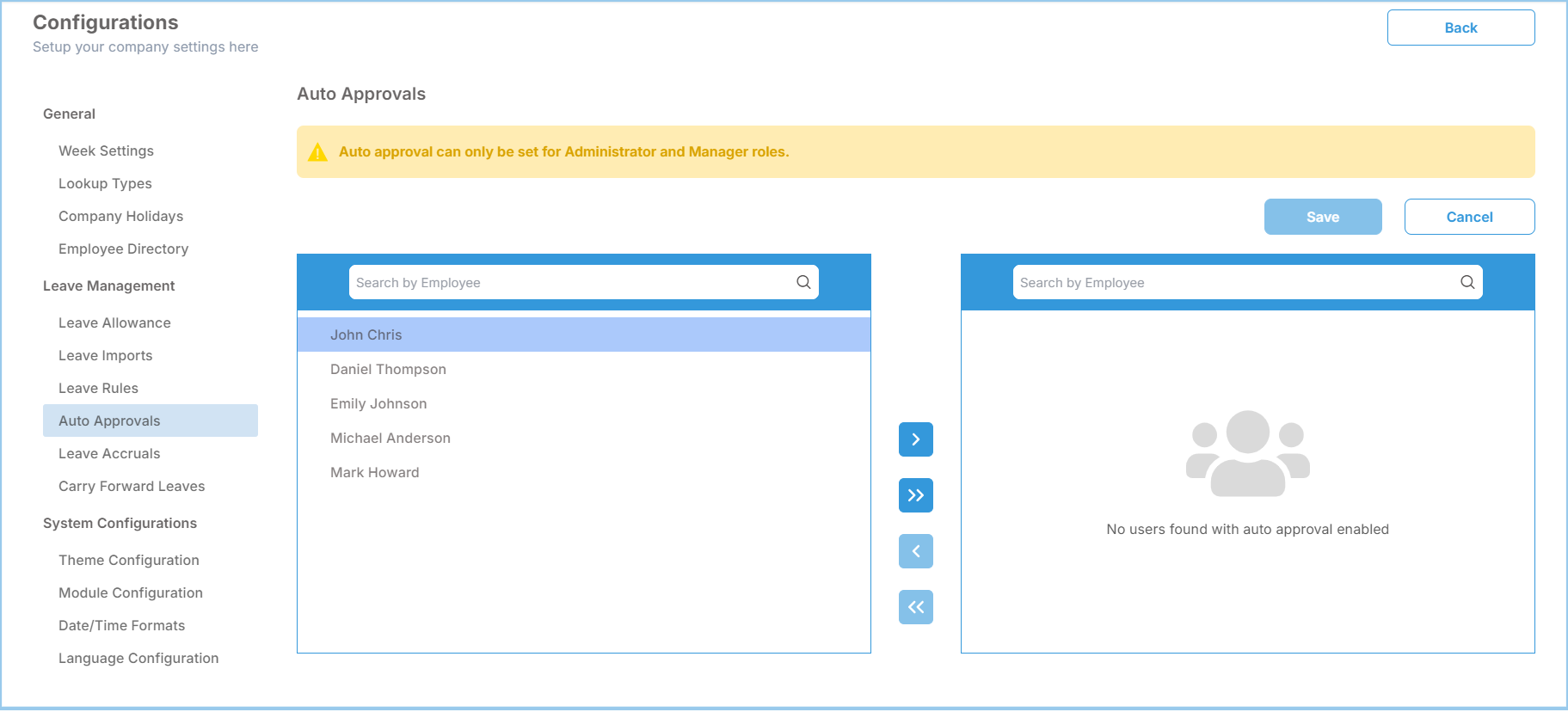 On the Auto Approvals page, you can enable employees to automatically approve leave requests.