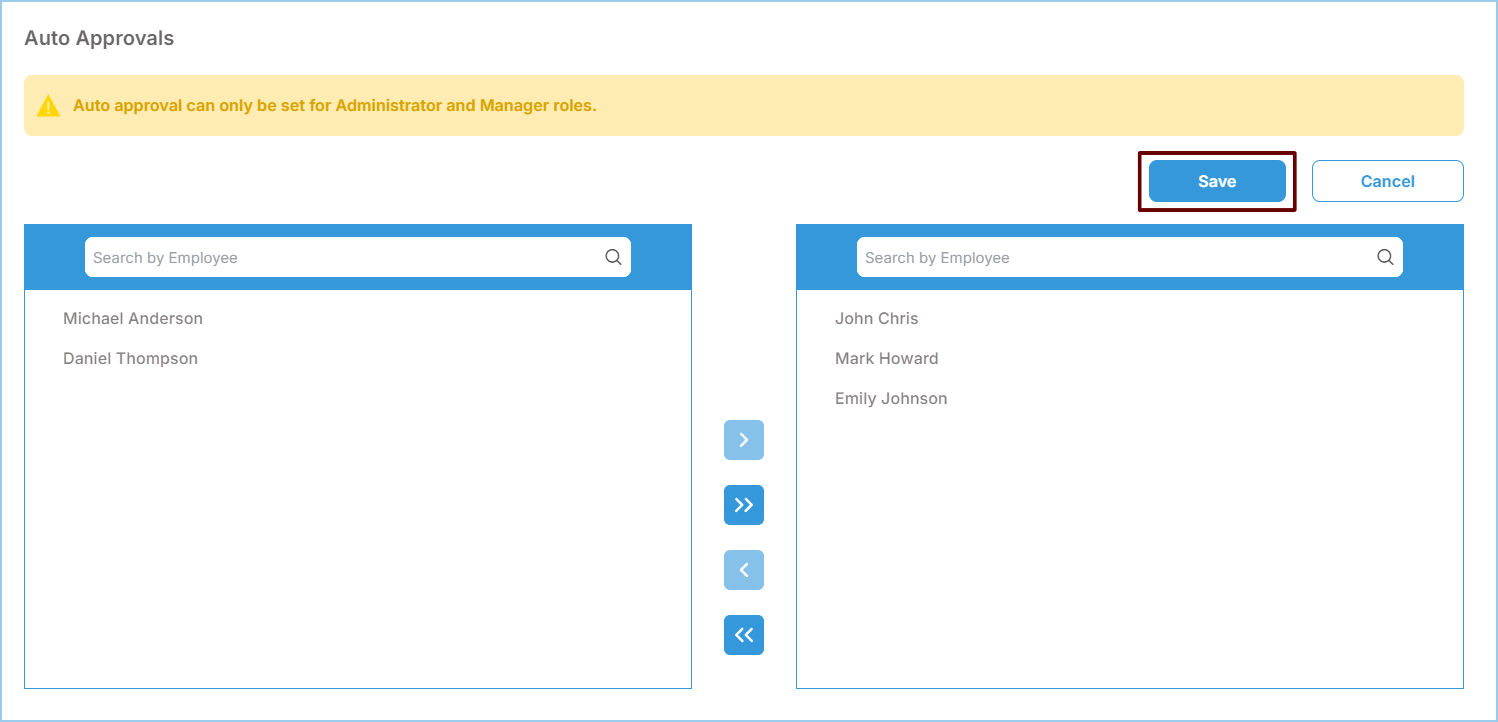 On the left side of the page, you can select the employees who are authorized for auto approvals. Use the following buttons to manage the selections: