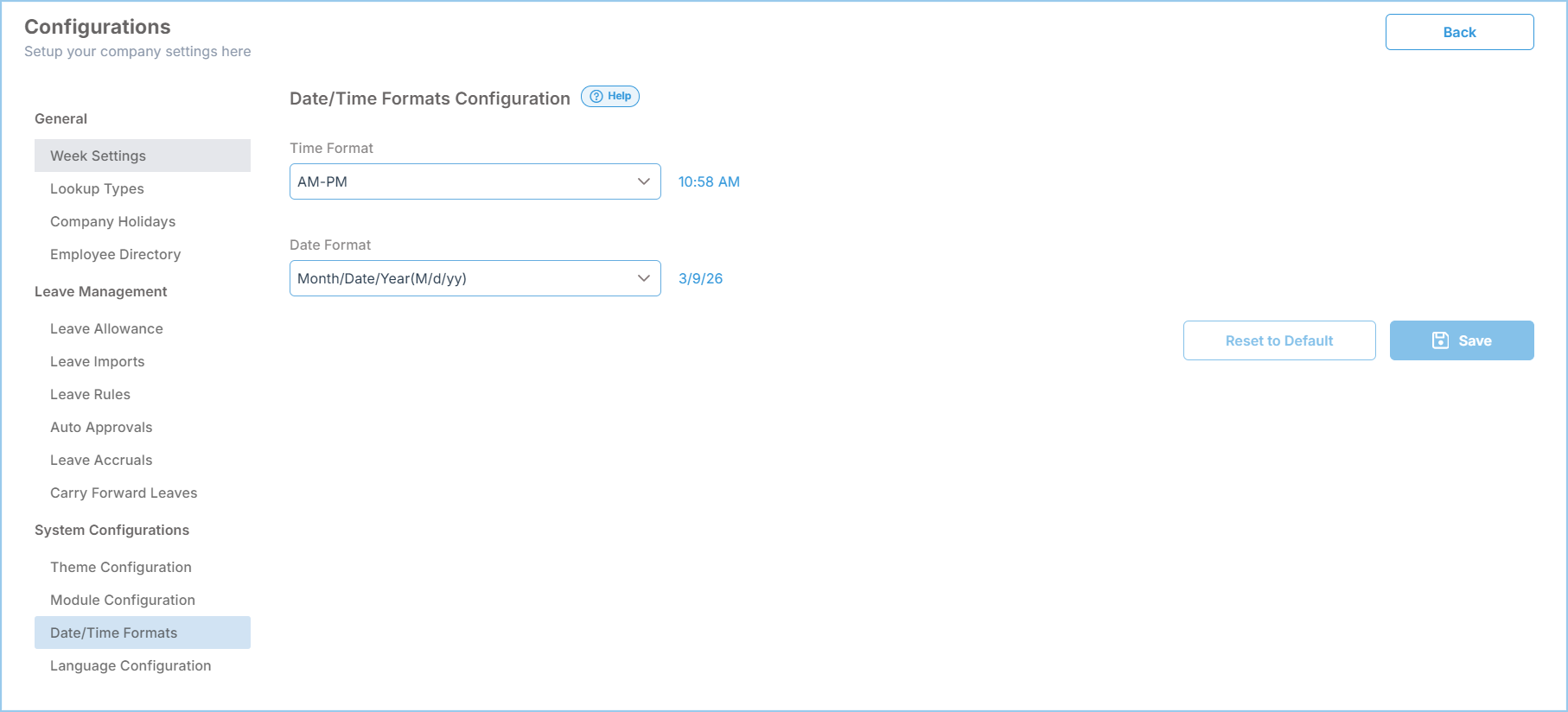 Here you can update the time format to 12-Hour Clock format (With AM, PM) or 24-Hour Clock time format.