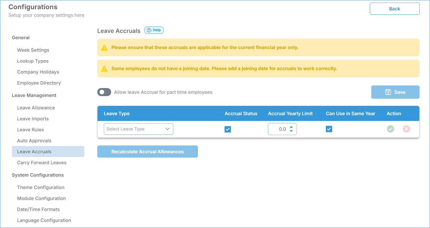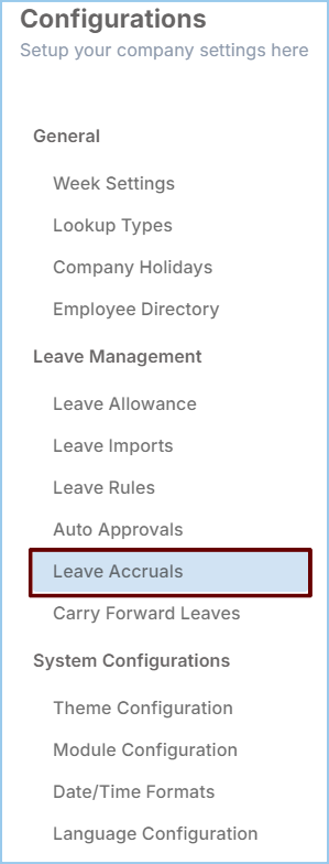 Leave Accruals setup is can only done by the Administrator role. To configure these settings, start by going to the settings in the left-side menu and selecting the "Configurations" option.