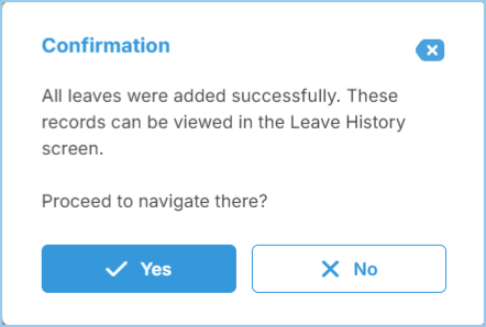 After your leave details uploaded, and you will receive a confirmation of the upload. It prompts navigation to the "Leave History" page to display your successfully added past leave details.