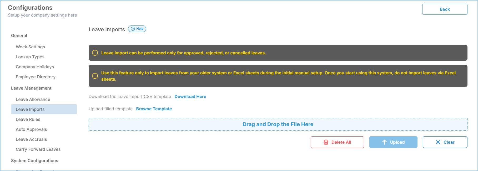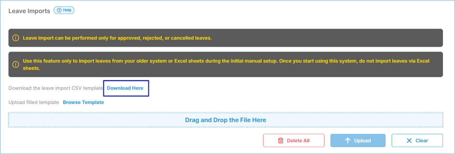 On the Leave Imports page you can import the past leave requests which are Approved, Rejected or Cancelled. This feature helps you to import leaves from your older system or Excel sheets during the initial manual setup.
