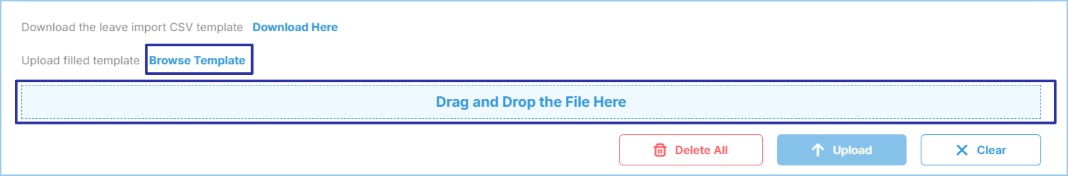 Once you have formatted your past leave information according to the template, either use the 'Browse Template' link or Drag and Drop your file to the given area to upload your data.