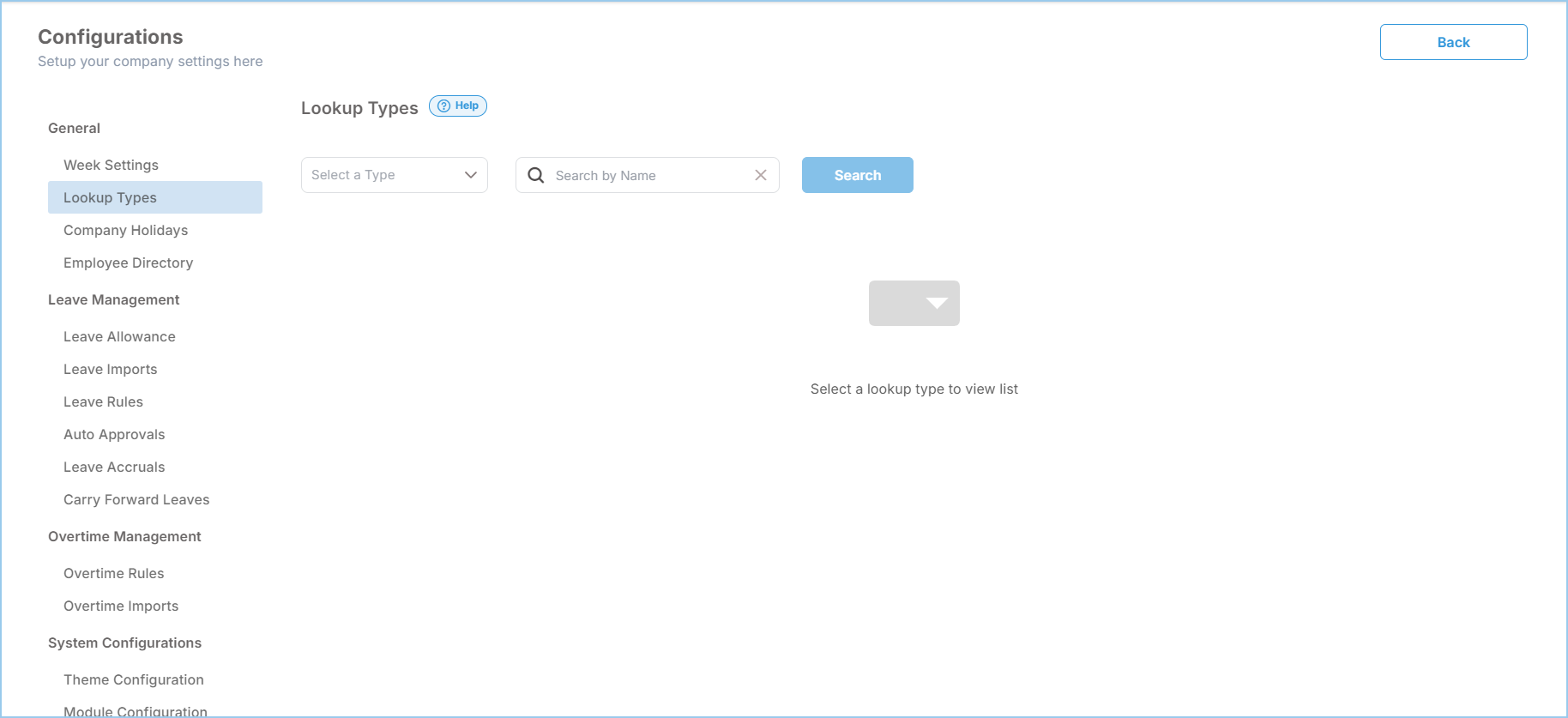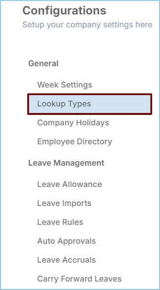 You can manage four main Lookup Types in the configurations. These are: Departments, Sections/Units, Leave Types, and Designations.