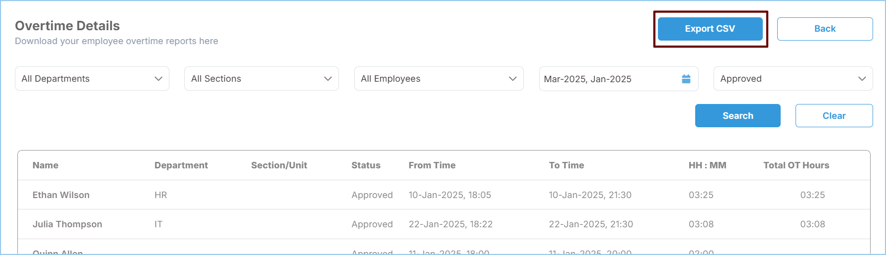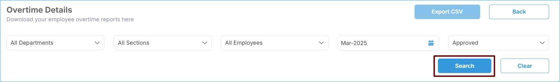 Administrator and Manager roles can see the Overtime details of all employees. Approver role can only see the overtime summary details for the employees assigned to them.